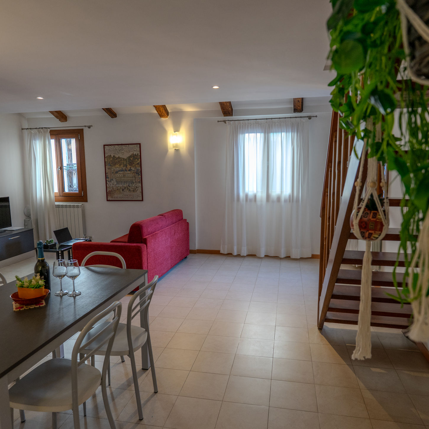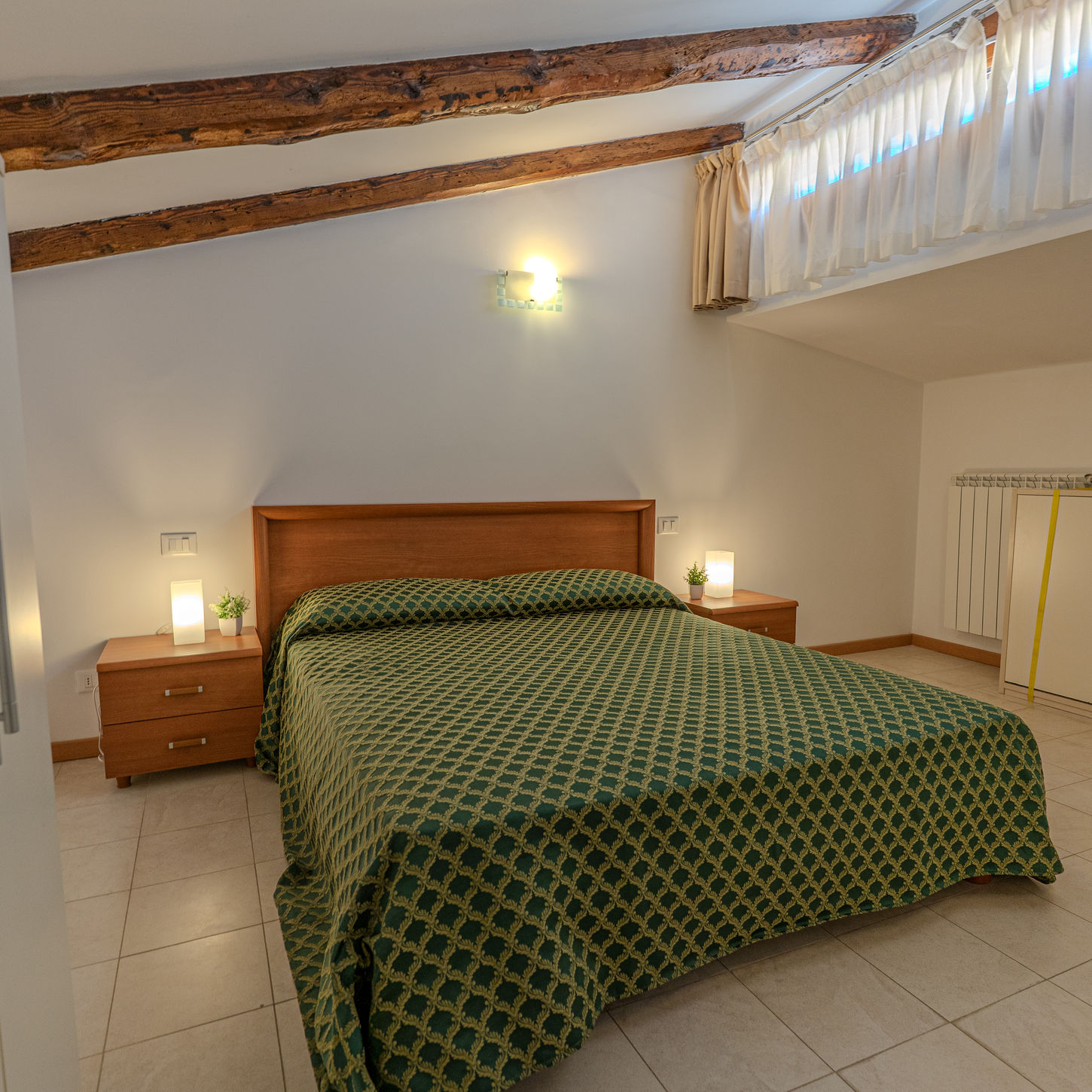 Si trova ,al 3° piano ed è composto da: soggiorno con divano letto, sala da pranzo, cucina attrezzata con piano cottura ad induzione, aria condizionata, e riscaldamento ,bagno con doccia, al piano superiore è presente una confortevole e spaziosa camera da letto matrimoniale con bagno privato ed accessoriato L'alloggio può ospitare da 2 a 4 persone ed è perfetto per chi ha in programma soggiorni medio-lunghi